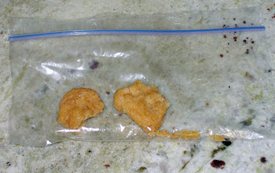 Now this is whats bothering me. After a week, bananas bruise and begin to rot. I’ve found tomatoes in the bottom of the crisper that have rotten through and through. I’ve had milk convert to yogurt and papayas brewing themselves into alcohol. But McNothing on the McNugget. The McNugget is not growing fungus or mold. This is really odd and to think we eat this stuff…its really scary. Might this not digest in our belly?